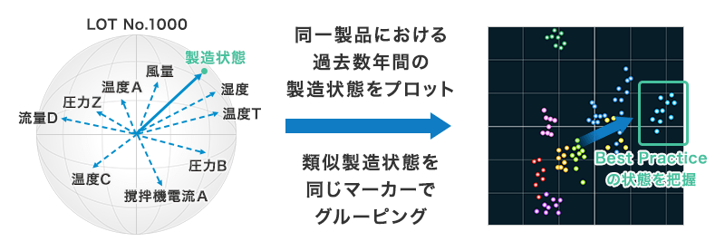 プロット分布をグループ化し、分布パターンと品質や歩留まり等の品質データと照合して、製造状態の良否を判定します。結果が良好であったグループの製造条件が、目指すべき製造状態として可視化されます。