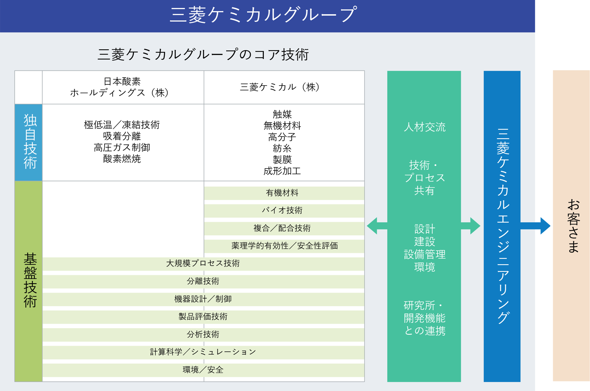 当社は三菱ケミカルグループ株式会社の広範な事業分野の設備技術部門として、長年にわたって人材交流、技術共有、研究開発部門との連携を重ねて発展してまいりました。
